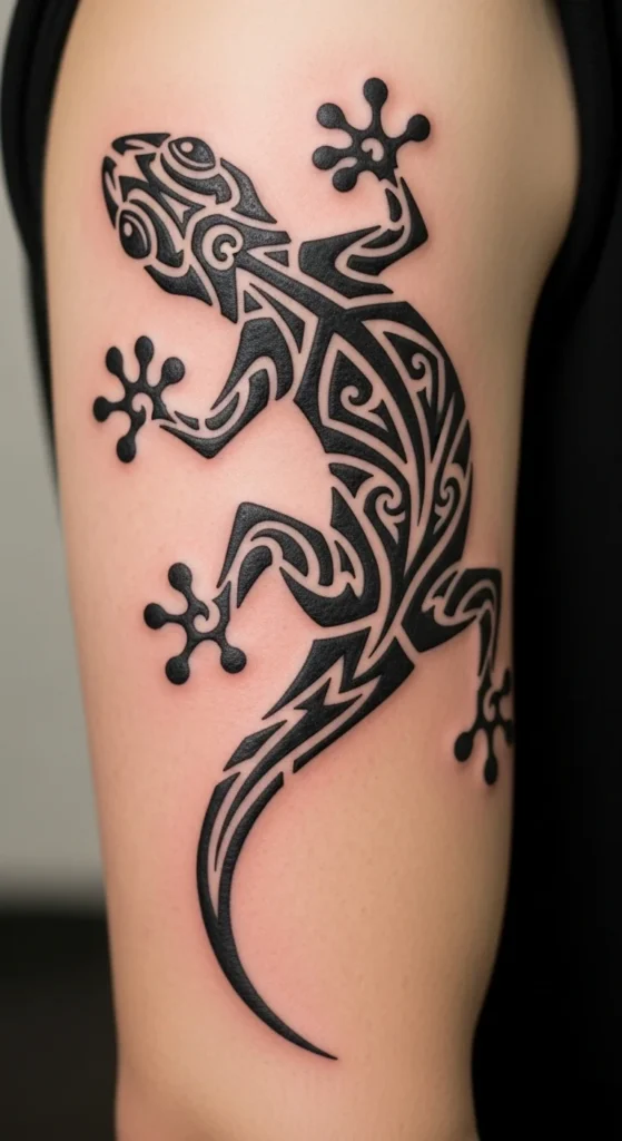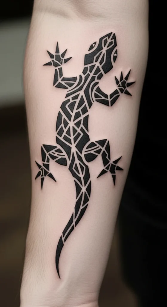 Lizards show up in many Pacific and Caribbean tribal traditions. The long body and tail let you form fun shape patterns. For a low-cost planning method, print a lizard outline and cut out the body and limbs. Move them around your arm until the angle feels right. Fill the lizard with triangles, spirals, or simple block patterns. Keep the outer outline thick. This makes the shape pop against the skin. The idea works on the forearm, ribs, or calf. If you want to expand, add shadow-like lines behind the lizard later.