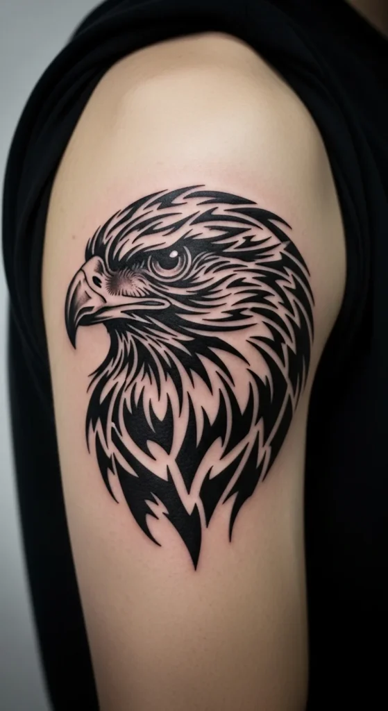 A hawk head combines strength and focus in a single shape. Keep the beak clean and sharp. Use bold blocks for the eyes and crown. Place it on the shoulder or upper arm where the curved area supports the outline. You can test the tilt by printing a hawk silhouette and taping it sideways, downward, or upward. Small angle changes affect the mood. If you prefer a simple session, stick to plain black shapes. Add background curves later when you’re ready for expansion.