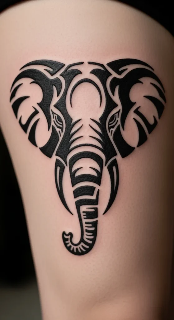 Elephant shapes look powerful in tribal lines. Keep the trunk long and simple. Use thick curves for ears and a solid outline so the shape doesn’t blur with time. To plan cheaply, fold a paper in half and cut out an elephant head silhouette. Open it to check balance. Place the tattoo on a flat area like the thigh or upper back. These spots give room for the curved ears. If you want to expand later, add geometric blocks around the trunk or behind the head.