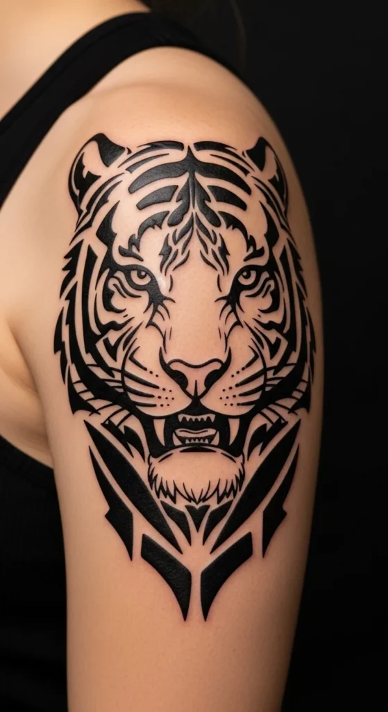A tribal tiger face offers a strong look with simple shapes. Focus on the eyes, nose, and stripes. Use bold angled lines to form the basic structure. A practical planning tip: cut the tiger shape from black cardstock and tape it on your shoulder. Rotate it until the stripes match your arm flow. If you want a lighter session, skip extra background shapes. If you want to expand later, add a ring of triangles around the face.