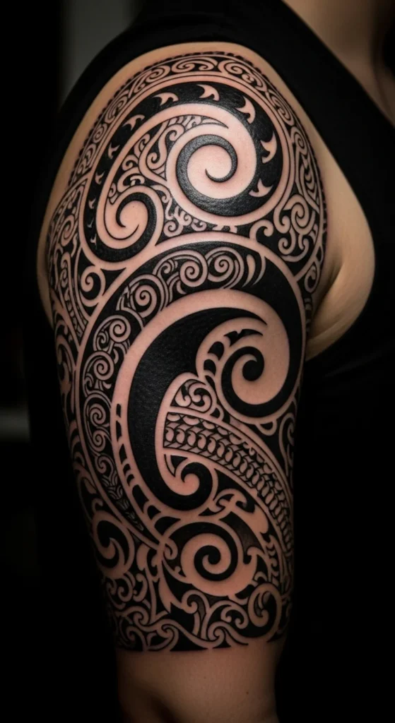 Maori tattoo culture carries a lot of meaning, especially when placed on the face. That area is sacred and not for non-Maori. But many people appreciate the flowing curves for arms or legs. Stick to non-sacred placements out of respect. Start with a simple spiral. Sketch it on paper a few times to see which direction feels natural. Use thick outlines with small filled shapes inside. This keeps the flow clear and readable from a distance. If you want a gentle way to preview the tattoo, cut shapes from black craft paper and tape them onto your arm. It costs almost nothing and helps you see how large or small the curves should be. Choose a placement that naturally bends, like biceps or calves. That makes the pattern look alive when you move. If you want a softer vibe, add negative space. White gaps create breathing room without extra detail. Keep the design practical so you won’t overspend on multi-session work.