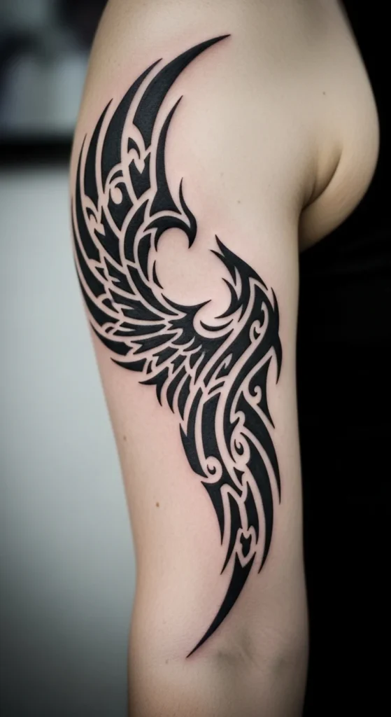 Phoenix shapes adapt nicely to tribal patterns because wings naturally form curves. Keep the wings thick and simple. Avoid tiny feathers. This design flows well on the outer arm or ribs. If you’re planning the curve, sketch a rising “S” shape first. Build the wings along it. For a low-cost preview, tape long curved strips of black paper on your arm to check movement. This shape grows easily. You can add more wing layers or tail shapes over time.