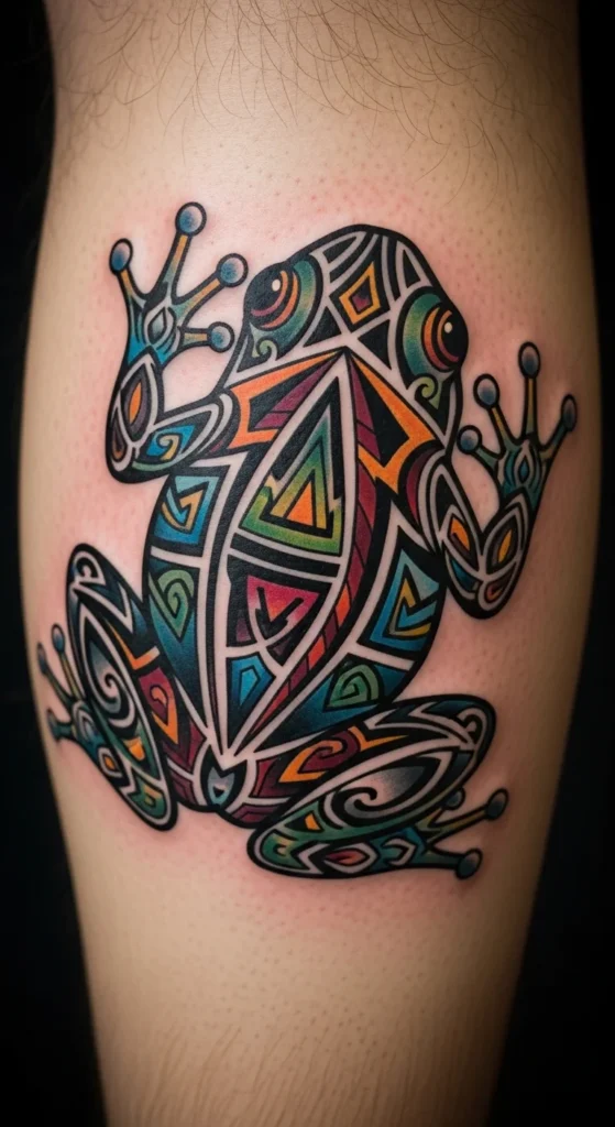 Frogs appear in several tribal traditions, symbolizing life changes. A frog shape is small, affordable, and beginner-friendly. Outline a simple frog stance—legs wide, body center. Fill the inside with block symbols or waves. To plan the size, draw the frog on sticker paper and try placements on your calf or arm. Keep the lines thick. Thin lines blur quickly. This is a great choice for people wanting meaning without large coverage.