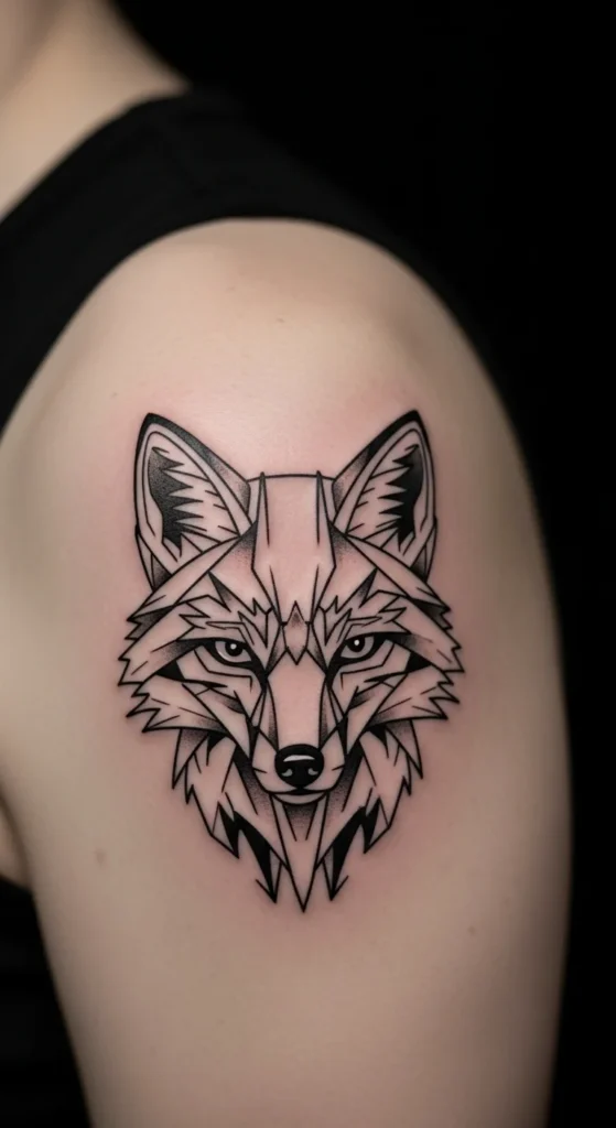 A fox head brings sharp angles and clever energy. Focus on the triangle-like ears and pointed snout. Outline the shape thickly and fill with repeating angles. This shape looks nice on the shoulder because the natural curve supports the face. A low-cost planning idea: print a fox outline and shade block areas with a black marker to see which areas should stay filled. Go for a simple version first, then add outer lines later.