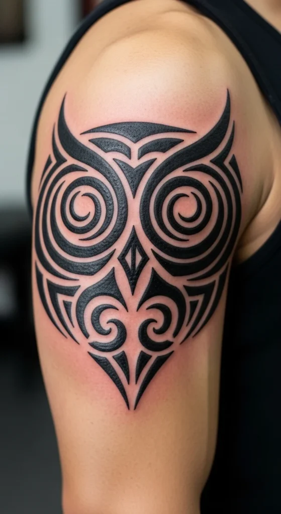 Owl masks combine circular eyes with strong block shapes. Start with two large circles. Add a curved top shape for the head. Fill the lower half with simple line groups. This works well on upper arms or chests. You can preview size by tracing circles from bottle caps or small bowls. A plain black version is affordable and fast. If you want more detail in the future, add layered arcs around the mask to form a frame.