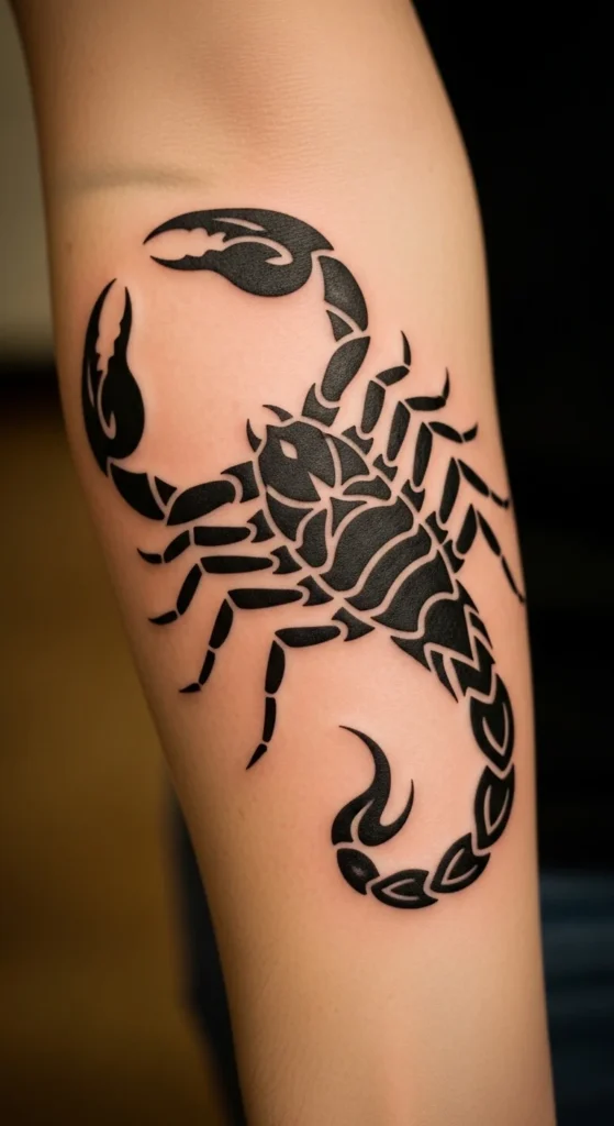 A scorpion brings a sharp, assertive look. The tail forms a natural curve that wraps along the arm. Draw the shape with clean lines. Keep the claws exaggerated and thick. Print a scorpion silhouette and tape it along your forearm to preview placement. If you want to keep costs low, stick to a silhouette rather than detailed segments. Later, add triangles or patterns inside the body if you want more personality.