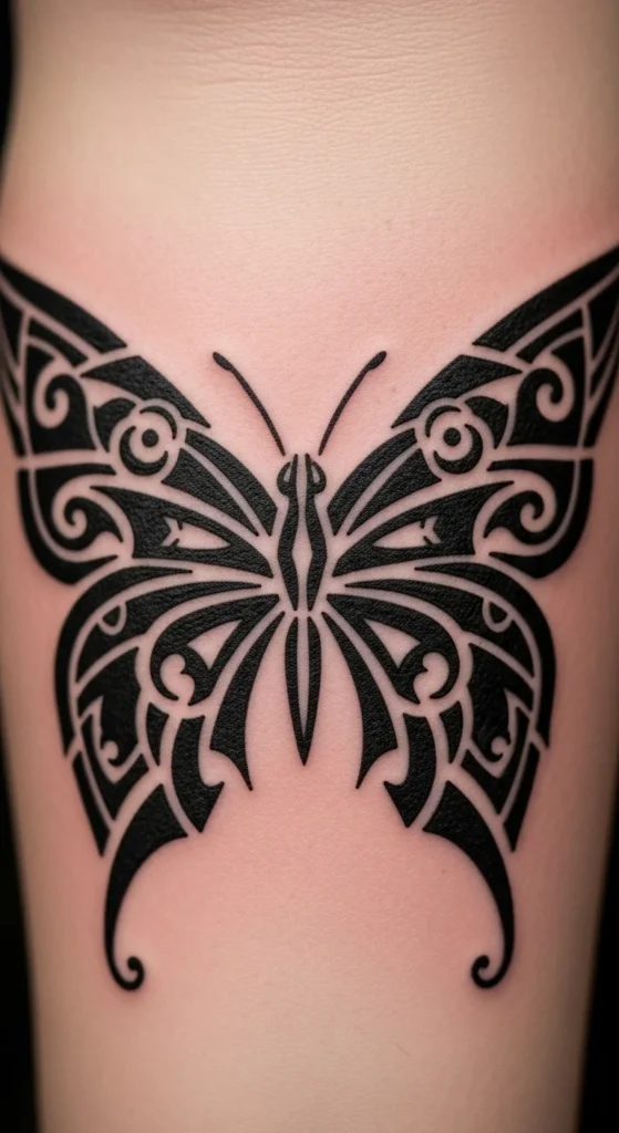A butterfly might seem gentle, but tribal shapes turn it into a strong symbol. Keep the wings bold, not thin. Use triangles and curves to build patterns inside. Place the design on the forearm or upper chest. To test symmetry, fold paper in half, draw half a wing, cut it, and open the shape. This keeps everything balanced. Begin with a simple silhouette to keep the price low. Add inside patterns later when you’re ready.