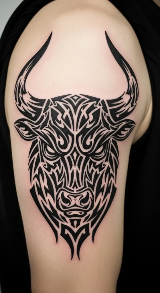 A bull head works nicely with tribal lines because the horns create clear arcs. Outline the head and horns with bold shapes. Keep the inside patterns minimal. A bull shape fits the upper arm well because the shoulder curve supports the horns. To test design angle, tape different horn shapes on your skin. Pick the one that feels the most natural. Stick to a plain black outline if you want an affordable session. Add background triangles later if you want upgrades.