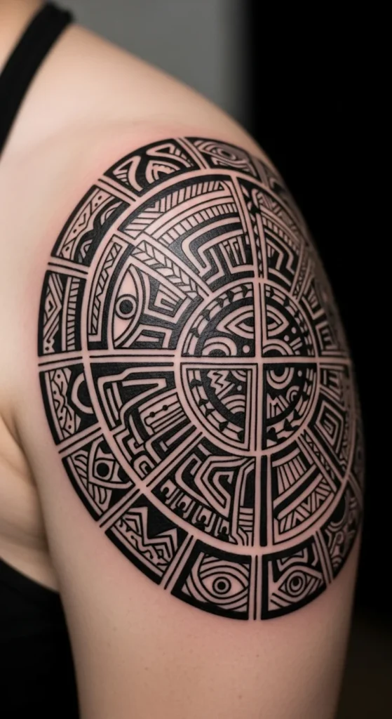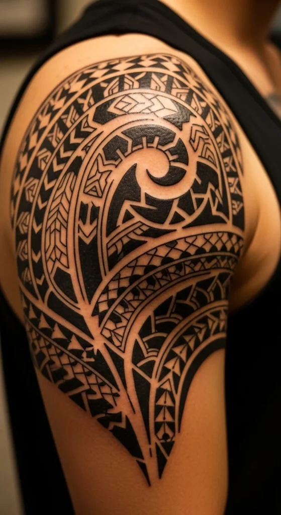 Marquesan tattoo symbols often form rounded “badge” shapes that fit perfectly on the shoulder. This makes them beginner-friendly. The circle-like design covers the shoulder cap and looks balanced from every angle. To plan it cheaply, use a traced circle from a bowl or lid and sketch inside it. Add shapes like triangles, curved peaks, or stacked lines. Keep the center simple. Let the outer ring carry the detail. This makes the piece easier to size and reduces session time. If you want to expand the tattoo in the future, add bands moving outward from the shoulder onto the bicep or chest. This gives the design a natural pathway. Use thick outlines because they hold up well as the skin stretches. If you’re unsure about the exact symbols, browse cultural symbols carefully and pick ones with meanings that relate to your story. This keeps the tattoo personal, not random.