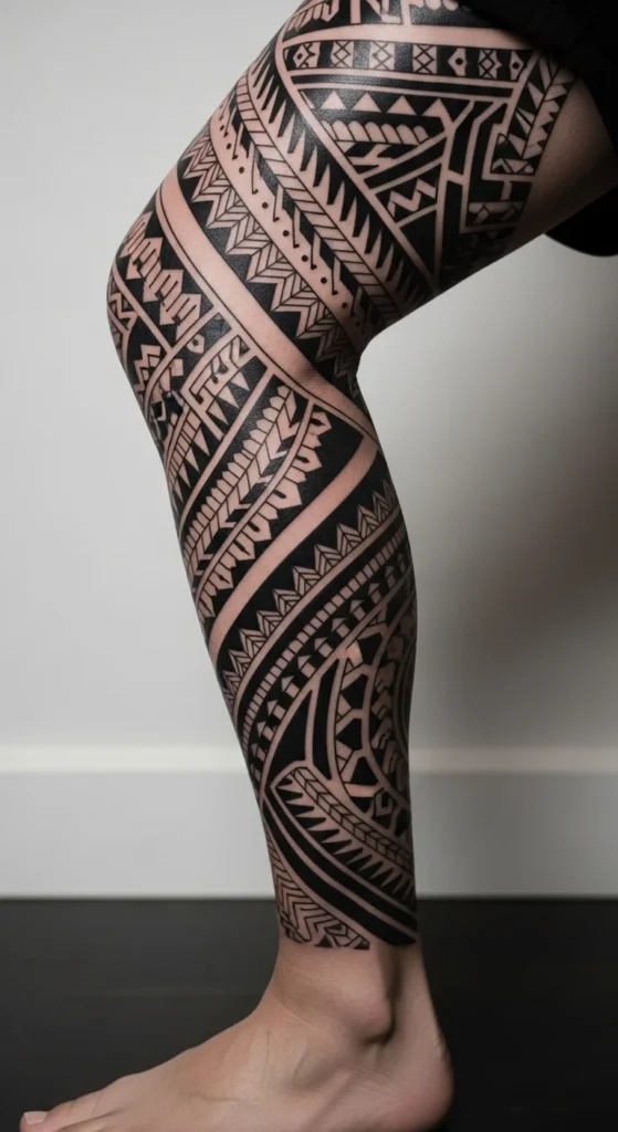 Leg sleeves are trending because they offer long vertical space for repeating shapes. Start small. Begin with one panel on the outer calf. Add more panels upward over weeks or months. This helps you spread out the cost and experiment with patterns. Use thick, repeating shapes like triangles, wave lines, or rectangles. If you want to plan the sleeve at home, tape pieces of black paper along your leg to test spacing. Keep the flow simple. Overcrowding makes tribal patterns blend together too much. Slow expansion keeps things affordable and lets you adjust your style as you go.