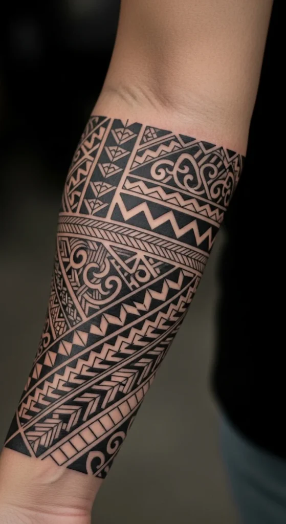 Samoan tattoos often include strong blocks of triangles and lines arranged in grids. They look great on arms because the natural cylinder shape helps the blocks wrap neatly. Start with one or two rows. That’s a budget-friendly move, and you can expand later into a half-piece or full sleeve. A simple trick: draw one row on your arm with black eyeliner to test thickness. It washes off easily and helps you plan spacing. Keep the shapes consistent so the pattern feels steady. Wide bands take longer to finish, so if you want a lower-cost tattoo, go for narrow rows. A small section on the forearm is an easy starting point. If you want deeper cultural alignment, search for traditional Samoan meanings behind each shape and pick the ones that match your personal story. Aim for clean edges and bold contrast. These patterns don’t rely on shading, which saves time and keeps the price manageable.