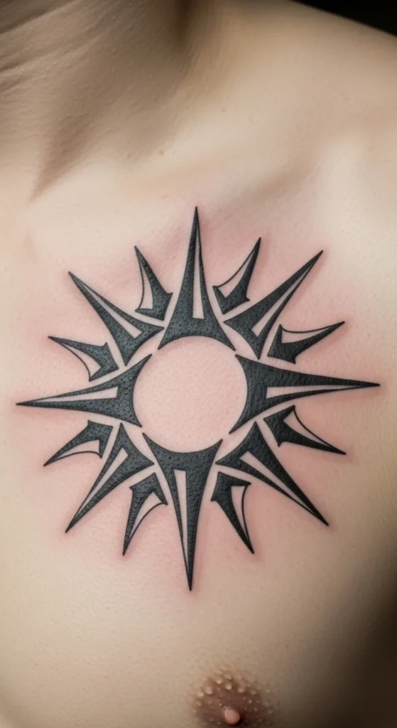 Tribal sun shapes show up in Polynesian, African, and Mesoamerican designs. They often stand for clarity, life, and direction. The round center gives artists a stable base, and the rays add energy. This is a good idea for anyone who wants a small-to-medium piece. To plan the shape at home, place a coin on paper as the center and sketch evenly spaced rays outward. Keep the rays thick so they don’t fade too thin. If you want a softer look, mix straight edges with curved edges. Place it on the chest or upper back. Both spots make the circle sit naturally. If you’re staying on a budget, go for fewer rays. It still looks strong. Many people start with a sun because it can be expanded later into a larger tribal project.