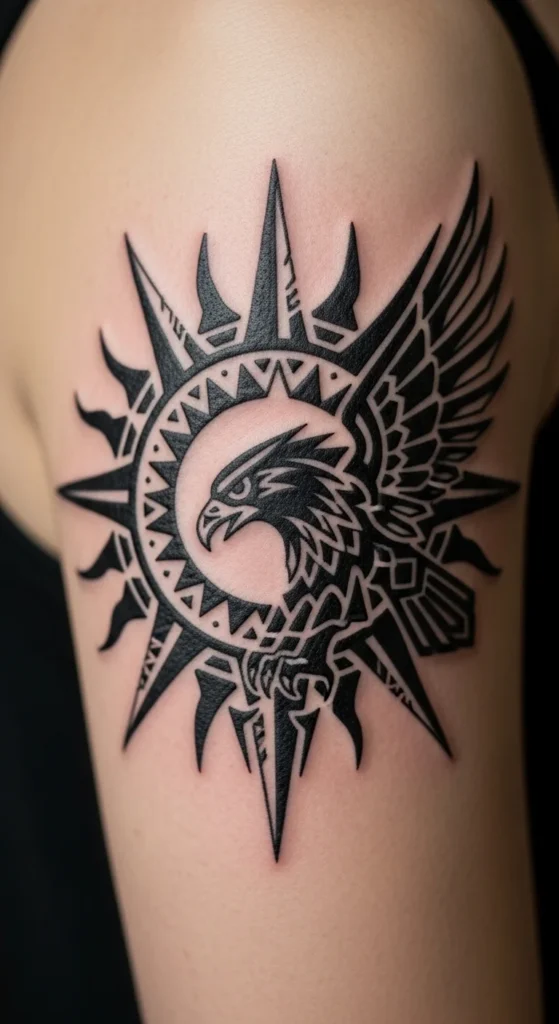 Mesoamerican symbols like suns, eagles, and calendar fragments bring a bold energy to tribal designs. They work well inside circles, squares, or half-sleeves. Many people like eagle heads because they’re easy to stylize with sharp edges. If you want a budget plan, start with an eagle facing sideways. Add small lines or triangles behind it for depth. Use thick shapes, not tiny details, because tiny details fade faster. You can preview an eagle by cutting a silhouette from black cardstock and placing it on your arm. That helps with tilt and direction. This theme also pairs nicely with forearm or chest placements. Keep shading minimal to keep the cost down.